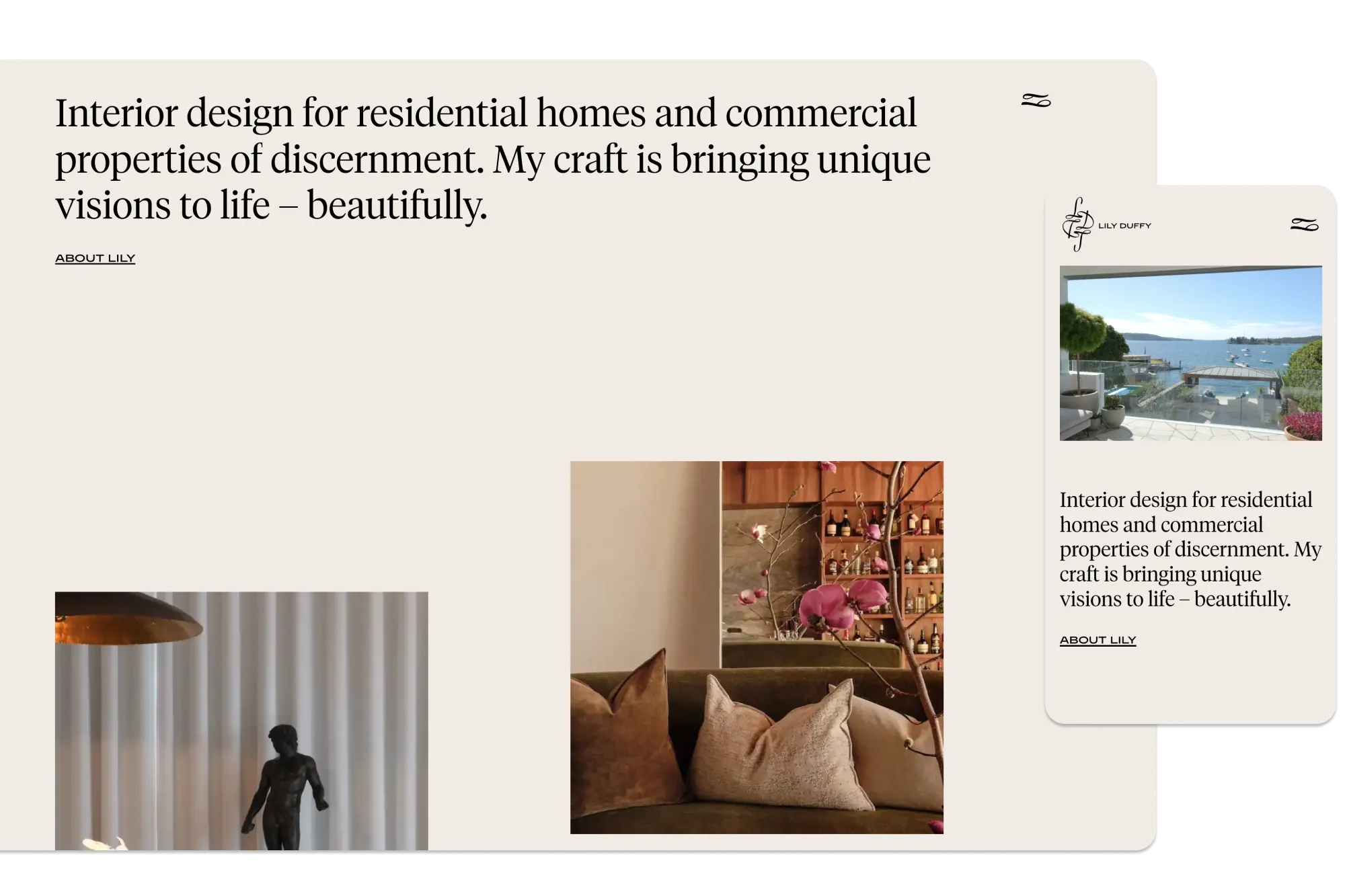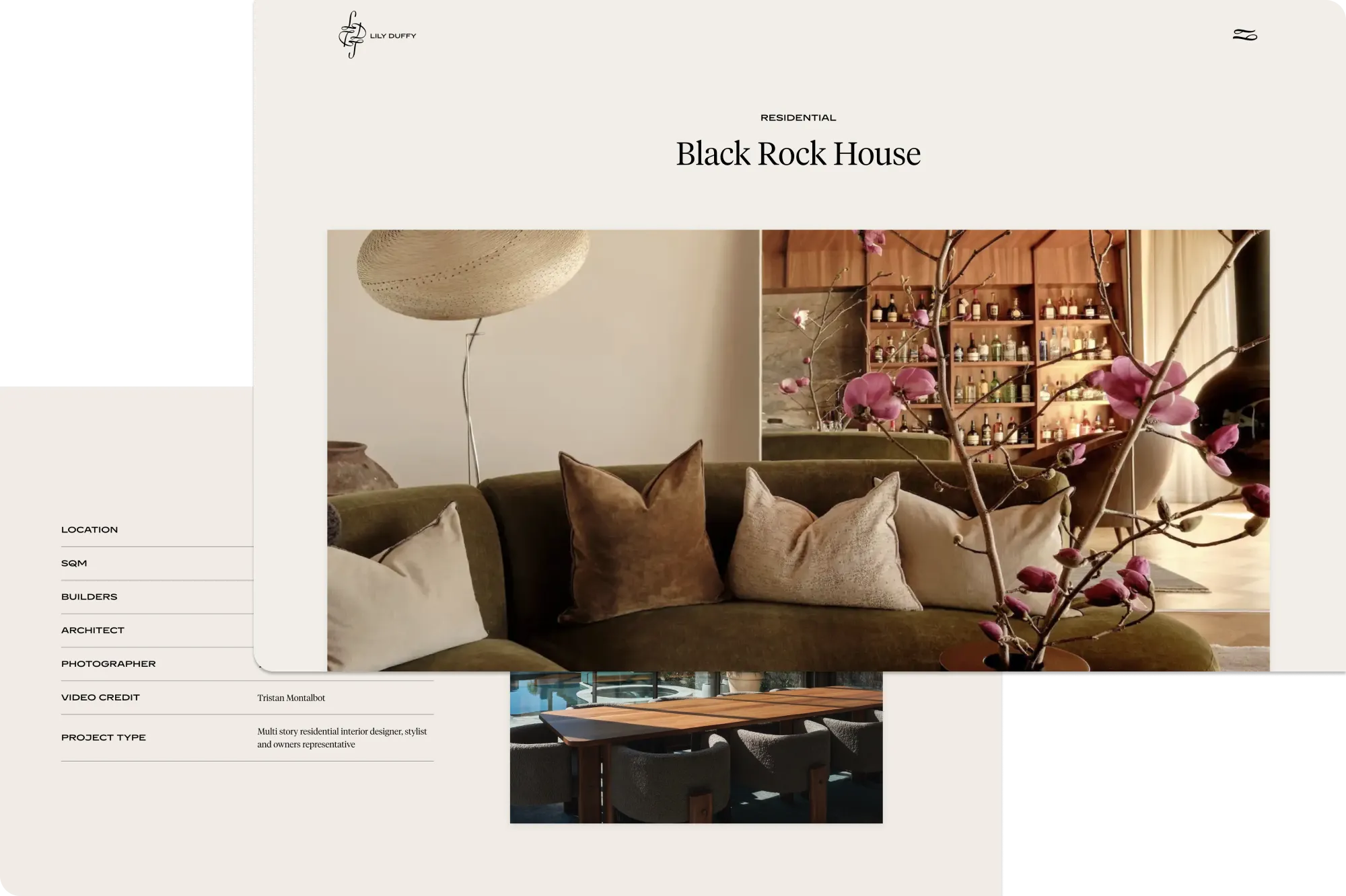 www.lilyroseduffy.comLily Rose Duffy is a Sydney-based interior designer working across residential and commercial projects. As her portfolio and client base evolved, her website needed to better reflect her work, support a refined brand identity, and provide a flexible platform capable of growing alongside her practice.