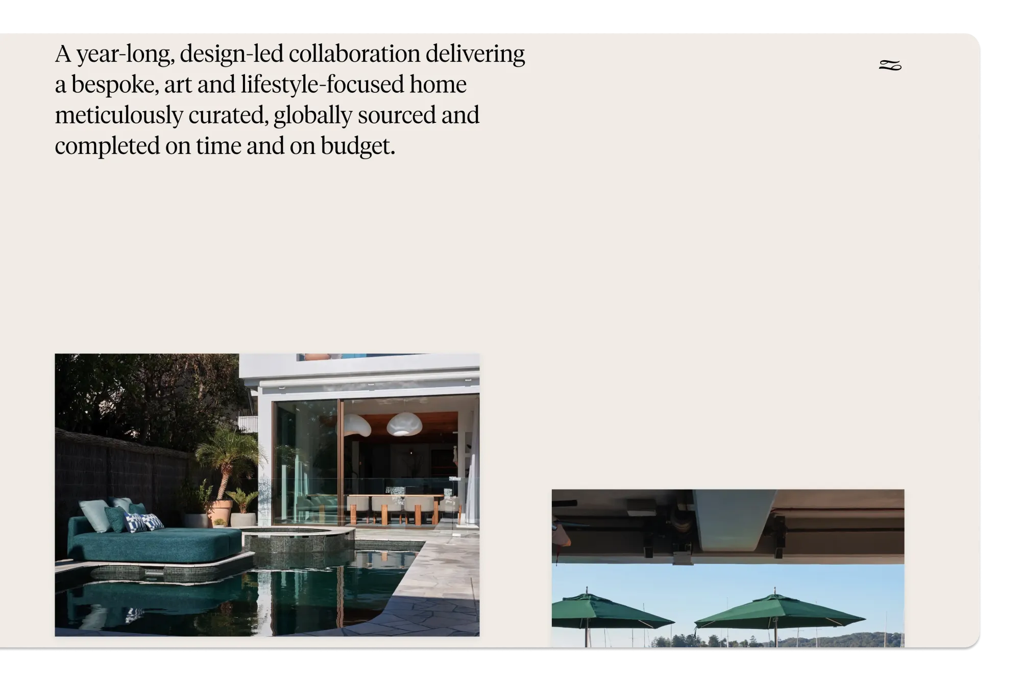 The new website presents Lily’s portfolio with clarity and confidence, elevating visual storytelling and positioning the brand for high-end residential and commercial clients. Projects are now structured to highlight key details while maintaining a clean, editorial feel.