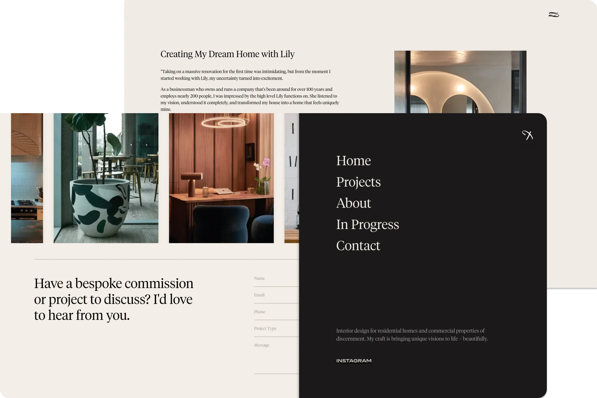 Lily’s previous Squarespace website had become limiting both visually and structurally. Layout constraints, responsiveness issues, and a lack of CMS flexibility made it difficult to present projects in a considered, premium way. The site no longer reflected the quality of her work or the direction of the brand.