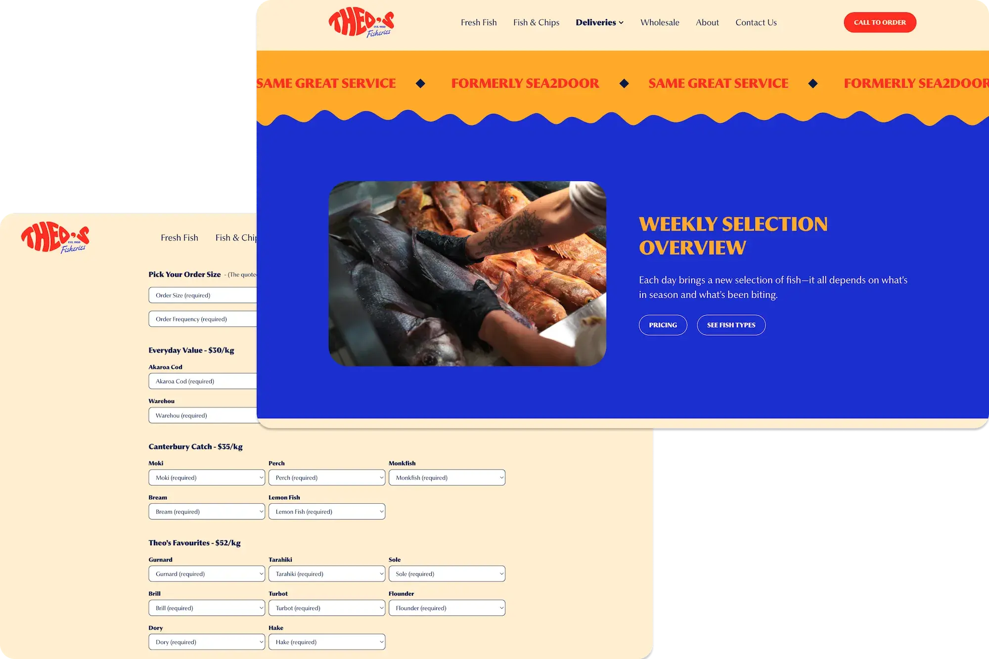 www.theosfisheries.co.nzA two-phase digital transformation delivered in partnership with Coside Branding Studio - encompassing brand evolution, Webflow implementation, and delivery-side UX improvements - for Theo's Fisheries, a long-standing food service business combining traditional fish and chip takeaway with fresh fish ordering and delivery. The project centred on modernising the digital experience while consolidating the separate Sea 2 Door delivery service under the Theo's Fisheries master brand, creating a more cohesive customer journey and a stronger platform for future delivery growth.